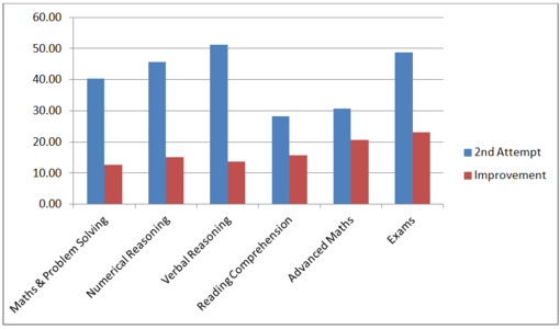 From our online learning site analysis the graph below demonstrates the number of students completing a second attempt (blue) and their improvement (red). Both are measured as a percentage and are determined as an aggregate for tests of similar kind. For example, all maths and problem solving test data for year 8 was combined. On average all maths tests are completed a second time by 40.44% of students and their average improvement is 12.66%. Other subject areas are also shown.