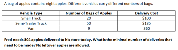 To answer this question, consider that there are 8 apples per bag. Fred needs 38 bags, he needs 1 small truck and 2 vans to deliver 38 bags, because he is not allowed left over apples. That is 3 deliveries in total.
